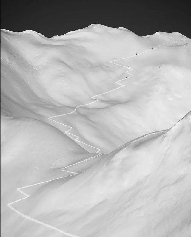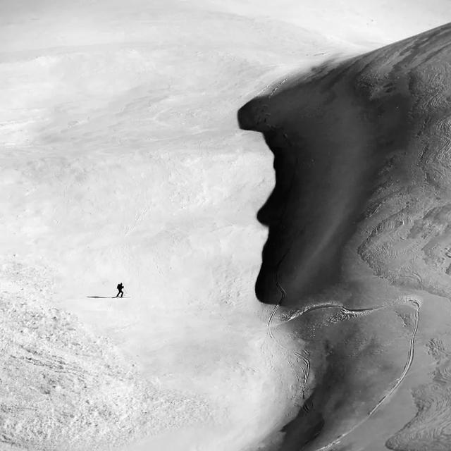 他的画面里,狂风雪留住的纹理像羊毫的皴擦,冰岛黑沙滩上的雪脊像宣纸上的墨痕,滑雪者的轨迹像画布上的一笔白口头。