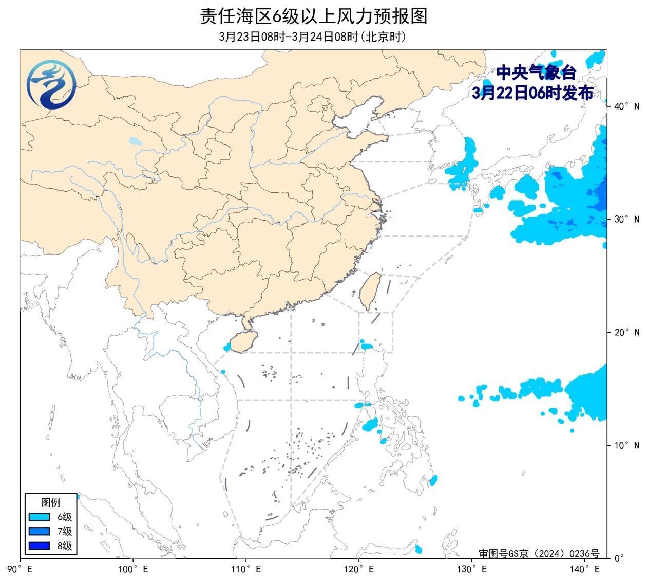 22日08时至23日08时,我国近海风力较小,以5级及以下为主。