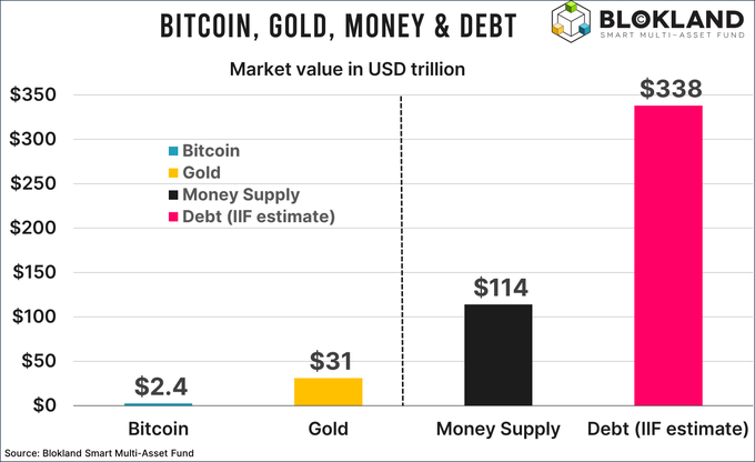 事实上,黄金真确的市值对比对象,大略不应是那些科技巨头们,而是环球惊东谈主的货币供应量以及愈发渊博的债务边界……