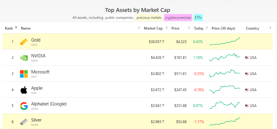 多位贵金属市集专科东谈主士在周四堤防到,把柄CompaniesMarketCap的数据表现,跟着金价屡创历史新高,黄金现在的总市值已险阻了30万亿好意思元,在环球财富市值排名榜上断层朝上。
